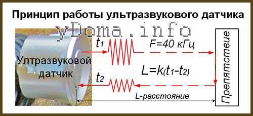 Работает датчик следующим образом. С электронного блока на излучатель датчика периодически подается пачка импульсов частотой 40 кГц. Если на пути импульса встречается препятствие, то он отражается и улавливается микрофоном. Далее передается в электронный блок обработки сигнала, который измеряет промежуток времени между моментом излучения импульса и времени его возврата от препятствия. Чем дальше находится препятствие, тем больше нужно времени для возврата сигнала к датчику. Таким простым путем и определяется расстояние. Электронному блоку остается только преобразовать время путешествия импульса в метры и вывести информацию на дисплей.