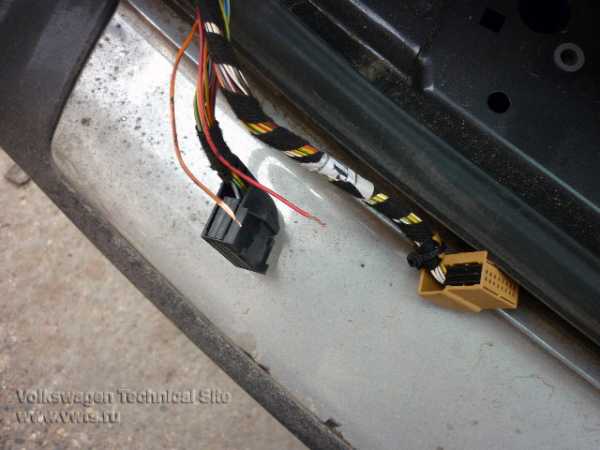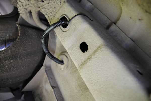 Провод от переднего левого датчика лучше пустить по другой стороне моторного отсека под аккумулятором. Для того, чтоб протянуть остальные провода, можно использовать штатную гофру, если таковая имеется. Кабель протягивается в салон через технологическое отверстие.