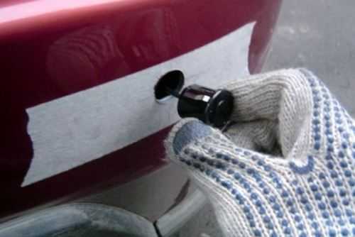 После этого в отверстия вставляются датчики сенсорами наружу (проводами во внутрь). Бамперы некоторых автомобилей имеют подкладку под пластиком — демпфер. В таком случае просунуть провода Вам поможет кусок проволоки или гвоздь. Предварительно сделав в демпфере дырку под провод, примотайте кабель к гвоздю изолентой и протяните во внутрь.