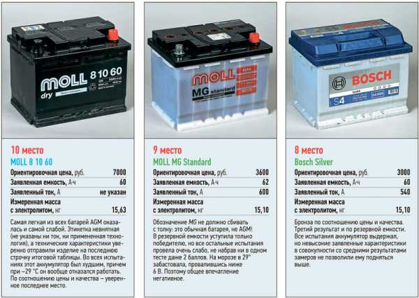 Все протестированные AGM аккумуляторы впечатляют большой выносливостью. Победитель Banner Running Bull AGM обеспечивает хороший холодный старт. Второе место за Varta AGM Start Stop. Moll AGM отличается большой выносливостью после глубокой разрядки. Среди обычных свинцово-кислотных аккумуляторных батарей победителем стал Exide Premium с лучшей емкостью, следом за ним идет Moll-Batterie. Неплохие характеристики у Sonnenschein Startline и Varta Silver, занявших 2 и 3 места.