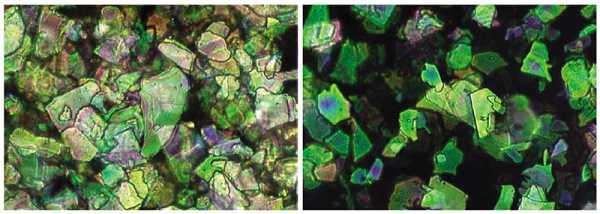 Если посмотреть на эти компоненты под сильным увеличением, то мы отчетливо увидим разницу в структуре «классического» перламутра (слева) и «ксираллика».