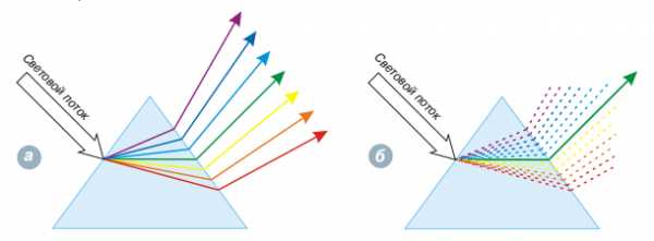 а) преломление световых лучей призмой Ньютона; б) преломление световых лучей в зерне перламутра