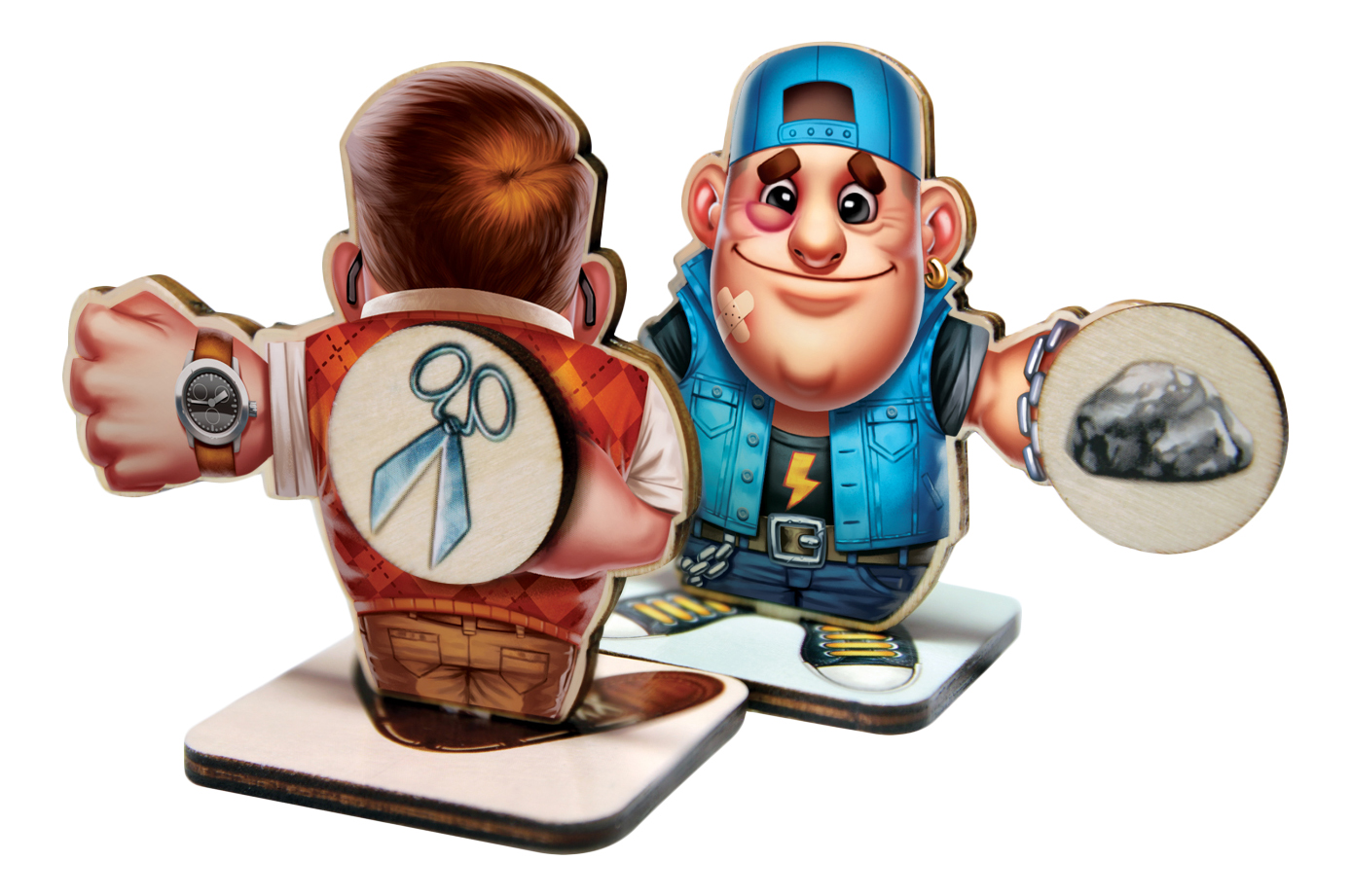 Для нападения и защиты соперники используют деревянные кругляшки с традиционными изображениями камня, ножницы или бумаги. И нововведений: флаги противников и грозный динамит.