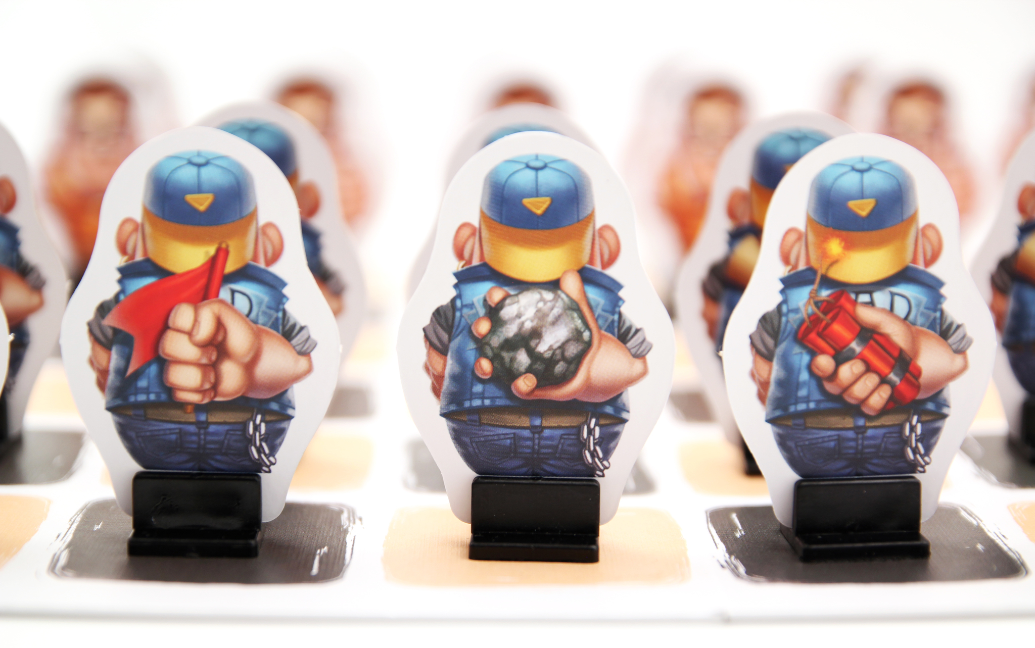 Отличить человечков на поле достаточно легко, несмотря на одинаковую форму фишек – яркие наклейки не дадут ошибиться, да и стиль противоборствующих лагерей кардинально отличается друг от друга.
