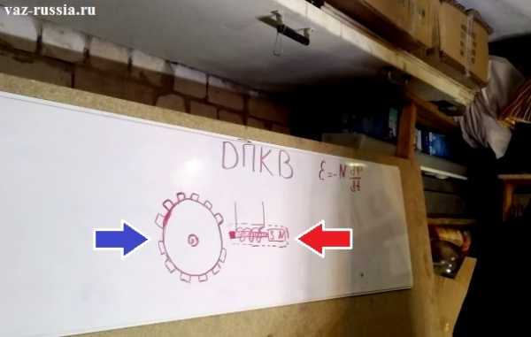 Работа данного датчика состоит из электромагнитных импульсов, то есть он отдаёт показания которые считывает со шкива коленвала (Шкив указан синей стрелкой, датчик красной) контроллеру, или как его ещё называют электронный блок управления двигателем, а блок уже в это время определяет положение коленвала и даёт команду форсункам чтобы они топливо вливали в двигатель, так как поршни подходят в верхнее положение, а так же благодаря этому датчику ещё и искра происходит, опять же всё это делается в тот момент когда поршни в ВМТ (Это Верхнее Мертвое Положение) подходят.