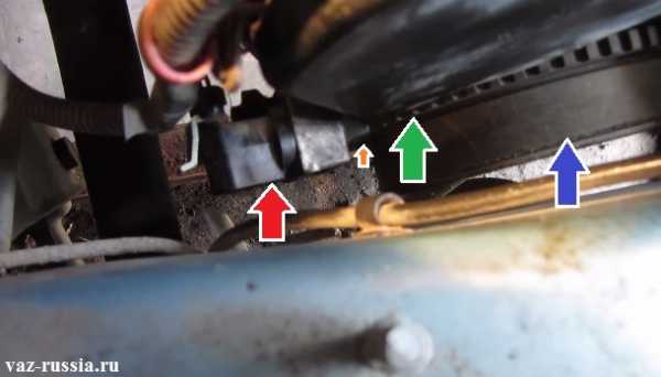 Чтобы вы всё в реальности могли это увидеть, а именно где сам датчик находиться, что за шкив коленвала, то вам в этом фото чуть ниже прекрасно поможет (На фото двигатель используется 2111, который на автомобили десятого семейства устанавливался и на Самары), начнём с поисков данного датчика в вашем автомобиле (Вить у вас совершенно другой двигатель может быть), сперва вам нужно будет найти коленчатый вал он находиться в самом низу двигателя автомобиля, так вот на конец этого вала устанавливается шкив с зубьями (Зубья шкива зелёной стрелкой указаны, по ним кстати и происходит считывание), его то и ищите, кроме этого на шкив так же ремень генератора установлен (Он синей стрелкой указан) ну и соответственно сам датчик смотрит на зубья этого шкива (Датчик указан красной стрелкой, а его кончик направленный на зубья шкива указан оранжевой стрелкой), вот по такому образу вы его и сможете найти беспрепятственно, самое главное на будущее запомните одну вещь, все бензиновые двигатели принципиально между собой не различаются и поэтому если у вас допустим другой автомобиль, то не нужно хвататься за голову и говорить что данный датчик вы никогда не найдёте, ещё раз повторимся, все бензиновые автомобили очень схожи между собой.