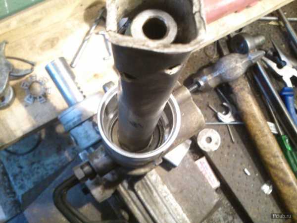 Под сальником находится подшипник, вначале запрессовываем его. Я использовал свечной ключ.