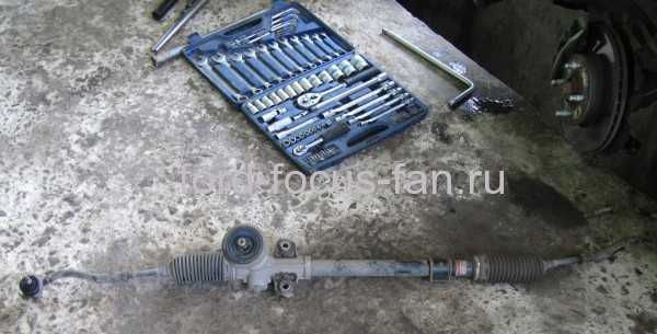 Для выполнения ремонта рулевых реек требуется стандартный набор инструментов, в том числе домкрат (в условиях сервиса это подъемник), различные ключи, съемники и сменные детали. Проблемы с рулевой рейкой на «Форд Фокус» обычно связаны с износом зубцов рейки и разрушением опорных втулок.