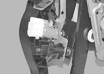 Датчик положения педали тормоза установлен на кронштейне педального узла и располагается над педалью тормоза.1. Отсоедините провод от клеммы «минус» аккумуляторной батареи. 2. Отверткой отожмите фиксатор…