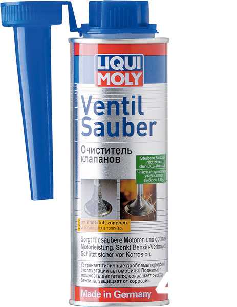 Кроме форсунок в камере сгорания есть ещё клапаны, для которых Liqui Moly рекомендует очиститель Ventil Sauber, эффективно удаляющий отложения. Эта присадка не подходит двигателям с непосредственным впрыском, зато отлично очищает обычный впрыск и карбюраторы. Кроме того, Ventil Sauber защищает топливную систему от коррозии и снижает вредные выбросы. Средство очень хорошо растворяет смолы. Важно, что при очистке гарантировано беззольное сгорание нагара, в результате чего очиститель клапанов совместим как с катализаторами, так и с турбонаддувом. Флакона в 250 мл достаточно на 75 л топлива, но заливать присадку нужно в бак, наполненный не менее чем наполовину.