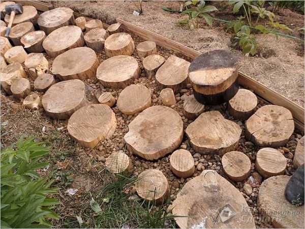 Перед заготовкой спилов или пеньков обязательно просчитывается глубина их вкапывания, из чего и высчитывается высота спила. Над грунтом они обычно выступают на 2-3 см. Дорожки из спилов вкапываются всегда, благодаря чему они считаются самыми «добротными» и устойчивыми.
