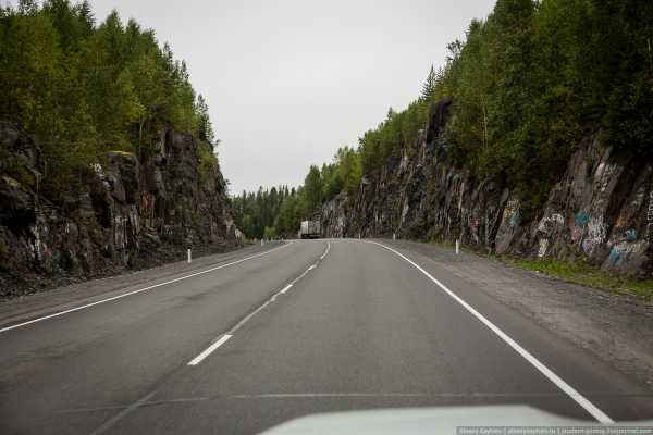 7. Продолжаем наше путешествие, проезжаем в разрезе скал, взорванных для прокладки трассы около Медвежьегорска.