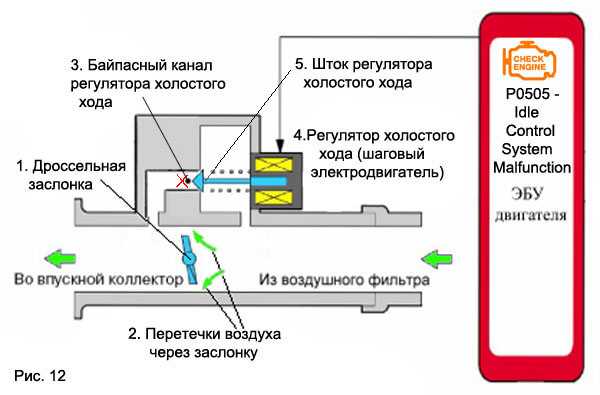 Блок управления двигателем начнёт реагировать на такое изменение и будет пытаться выставить обороты соответствующие холостому ходу. Он подаст команду регулятору холостого хода 4. уменьшить количество шагов на такое значение, чтобы обороты стали равными 750. Допустим с 20 шагов он уменьшил это значение до 5 и наши обороты пришли в норму. Но что будет если зазор между дроссельной заслонкой и стенками станет настолько большой, что регулятор 4., закрыв полностью байпасный канал 3., не сможет добиться нужных нам оборотов. Представим, что выставив «0» шагов (ISC STEP.MTR 0 STEP — этот показатель соответствует полностью закрытому байпасному каналу, на рис 12 это показано красным крестиком) обороты холостого хода так и не пришли в норму и составляют 1000 оборотов, как тогда отреагирует ЭБУ двигателя? Конечно, блок управления поймёт, что регулятор холостого хода не справляется со своей задачей и выдаст ошибку системы регулирования холостого хода. В данном случае P0505 — Idle Control System Malfunction. Многие увидев данную ошибку приговаривают к замене именно регулятор. Причина может быть и в нём, но в данном случае это не так, посмотрим на картинку ниже.