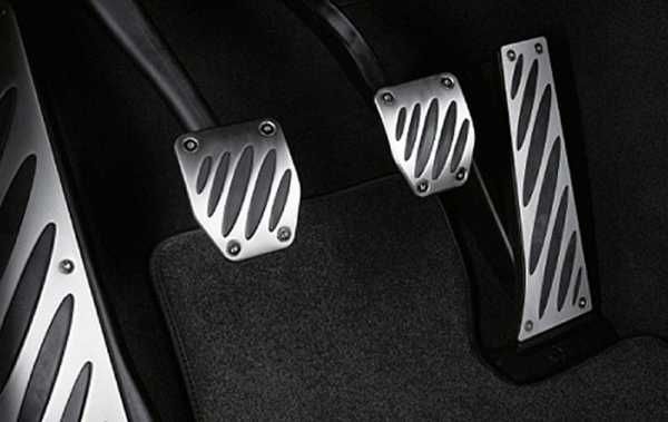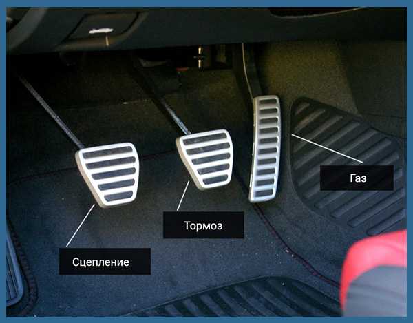 Автомобиль на механике оснащен тремя педалями: сцепление, тормоз и акселератор (газ). Педаль сцепления расположена слева, педаль тормоза посередине, а педаль акселератора справа.