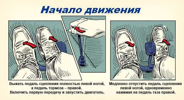 2) Постепенно отпуская ручник, выжмите педаль сцепление, перейдите на первую передачу и трогайтесь, добавив газа.