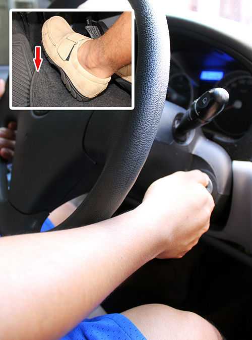 Левая нога полностью выжимает педаль сцепления, а правая нога нажимает на тормоз. Заводим машину.