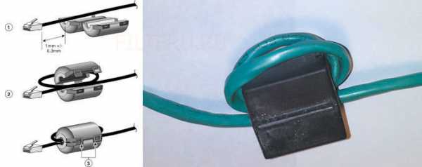 Индуктивность можно увеличить применением специального ферритового кольца. Как выглядят на кабелях ферритовые фильтры, можно посмотреть на фото ниже.