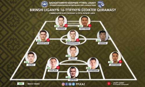 Профессиональная футбольная лига Казахстана представляет вашему вниманию символическую сборную 16-го тура Первой лиги сезона-2019, сообщает корреспондент KazFootball.kz.