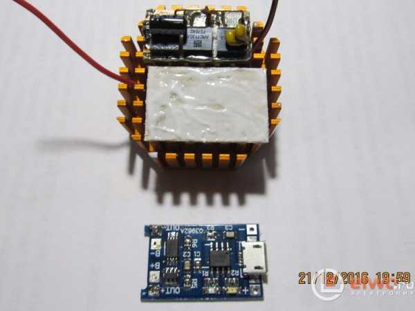 Как можно видеть, на плате драйвера установлены конденсаторы 10 мкф на входе и два по 0,1 мкф. Так вот, без них ток через светодиод составлял 850 мА, после их установки – 1030 мА. Далее, через прокладку из тонкого стеклотекстолита, приклеил к радиатору контроллер зарядки литиевого аккумулятора TP4056.