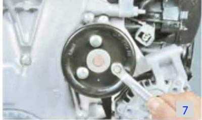 16. Выверните три болта крепления шкива привода водяного насоса, предварительно ослабив затяжку болтов…