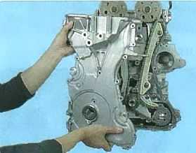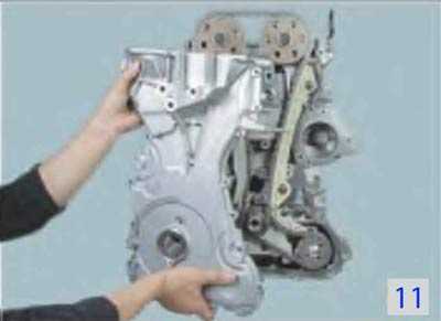 27. Осмотрите звездочки коленчатого и распределительных валов, состояние башмака натяжителя и успокоителя цепи. При необходимости замените дефектные детали.