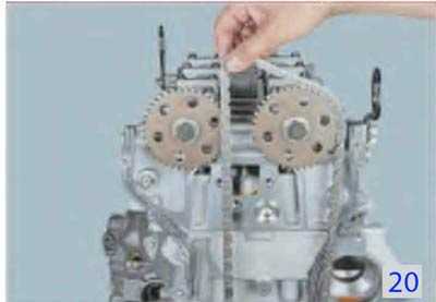 29. Наденьте новую цепь привода газораспределительного механизма на звездочку коленчатого вала и звездочки распределительных валов.