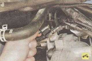 Ослабив хомут воздухозаборника, снимите гофру, которая соединяет корпус воздушного фильтра и воздуховод.
