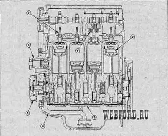1 — клапанный механизм, 2 — поршни; 3 — маслоотбойный щиток; 4 — всасывающий маслопровод; 5 — виброгаситель; 6 — водяной насос; 7 — свеча зажиганий.