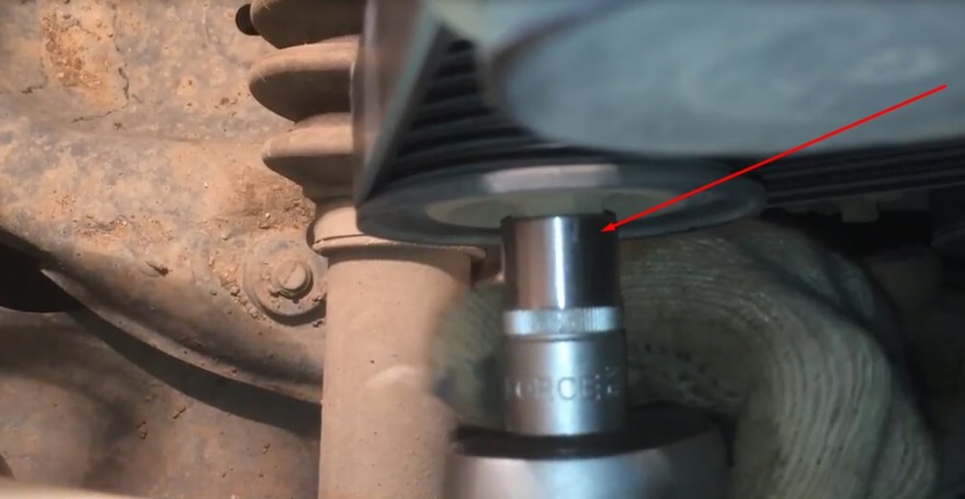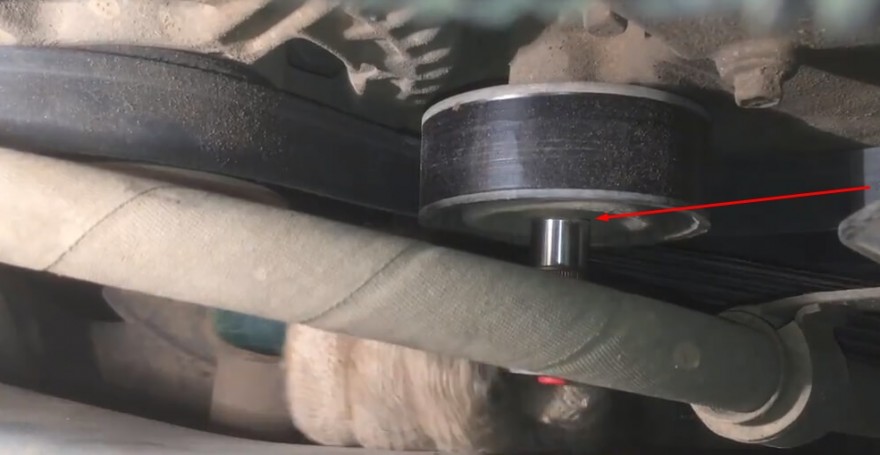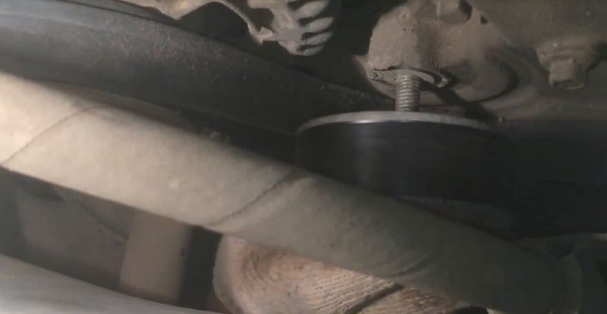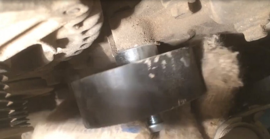Ставим машину на яму и демонтируем защиту силового агрегата. Далее просовываем руку и прокручиваем болт крепления ролика натяжки ремня вправо. Болт под головку на тринадцать.