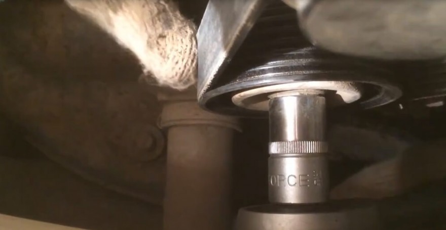 Установка на шкив водяного насоса приспособления для монтажа ремня привода вспомогательных агрегатов