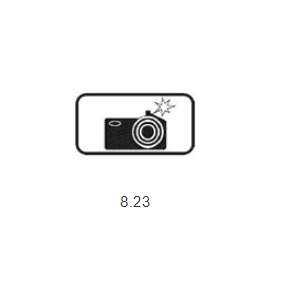 8.23 «Фотовидеофиксация». Применяется со знаками 1.1, 1.2, 1.8, 1.22, 3.1 — 3.7, 3.18.1, 3.18.2, 3.19, 3.20, 3.22, 3.24, 3.27 — 3.30, 5.14, 5.21, 5.27 и 5.31, а также со светофорами. Указывает, что в зоне действия дорожного знака либо на данном участке дороги может осуществляться фиксация административных правонарушений работающими в автоматическом режиме специальными техническими средствами, имеющими функции фото-, киносъемки и видеозаписи, или средствами фото-, киносъемки и видеозаписи.