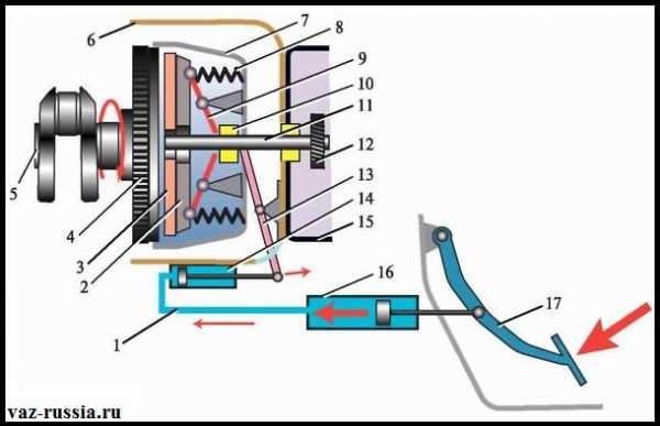 Сам по себе выжимной подшипник предназначен только лишь для отведения нажимного диска сцепления от ведомого диска, проще говоря он активируется только лишь при нажатии на педаль сцепления (Обозначена цифрой 17 на фото) и при её удерживании, то есть когда вы находитесь в автомобиле вы нажимаете на педаль, а после нажатия на педаль выжимной подшипник (Цифра 10) давит на отжимные рычаги (Цифра 9) тем самым отделяет нажимной диск сцепления (2) от ведомого (3) для того, чтобы шестерни которые находятся в коробки (Одна из множества шестерён коробки, указана цифрой 12) перестали вращаться, потому что как мы все знаем, для того чтобы переключить скорость на коробки её шестерни должны находится в неподвижном состоянии.