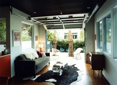 То есть, получиться так сказать дом с видом на террасу. Если же речь идет о замене стены стеклянной панелью, то конечным результатом станет просто большущее окно вместо ворот. Кому-то подобный вариант покажется чересчур открытый, поэтому многие останавливаются на переоборудовании ворот раздвижной системой створок.
