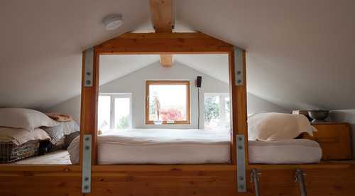 Над кроватью на верхнем этаже — три маленьких окошка, из которых открывается вид на внутренний садик. Единственное окно, которое выходит на улицу, расположено на высоком уровне с другой стороны дома.
