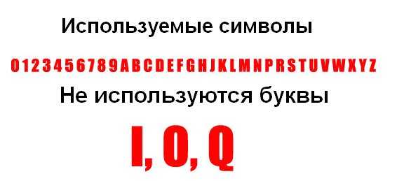 обращаем внимание, что буквы I,O,Q не используются из-за схожести начертания с цифрами, соответственно, есть и смещение цифр.