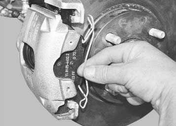 2. Снимите суппорт в сборе (см. «Замена суппорта в сборе с направляющей колодок»), не отсоединяя тормозной шланг, и закрепите его проволокой, не допуская скручивания или натяжения шланга. |