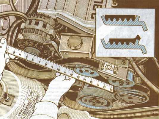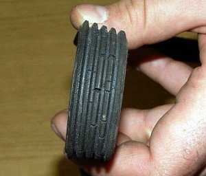 Во-первых, осмотрите все ремни и каждый шкив. Перегните каждый ремень и тщательно его проверьте. На простом клиновидном ремне осмотрите боковины, и, если они залоснились, это знак бокового соскальзывания – обычно вызванного неправильной установкой, но также может быть признаком негодного шкива. При осмотре многоручьевого ремня обратите внимание на отлетевшие кусочки резины. Особенно проверьте, нет ли между примыкающими ребрами промежутков, даже в половину дюйма.