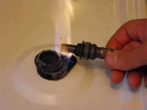 Это способ менее хлопотный, и практически исключает возможность повреждения датчика, в момент спиливания колпачка. Периодически обмакивая кислородный датчик все в ту же кислоту, подвергаем наконечник нагреванию на огне. В процессе нагрева может пойти реакция, продукты этой самой реакции можно смывать водой. Процедуру повторяем до тех пор, пока он полностью не очистится от налета.