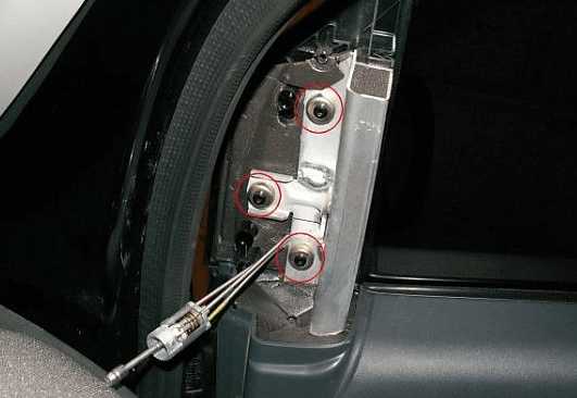 Снятие зеркала с механическим приводом. Для начала следует снять стопорную скобу регулятора зеркала, открутить три винта, которые крепят зеркало к каркасу двери, и после этого снять само зеркало.