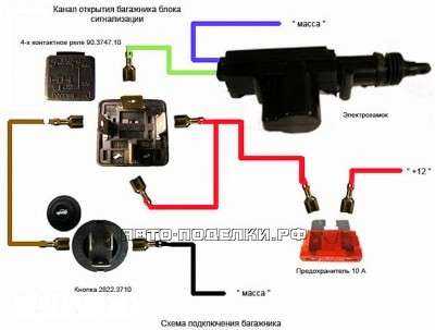 Дальше всё устанавливаем на места прокладываем провода (самое нудное дело) и подключаем у меня по такой схеме, чтобы еще с брелка сигналки открывалось.