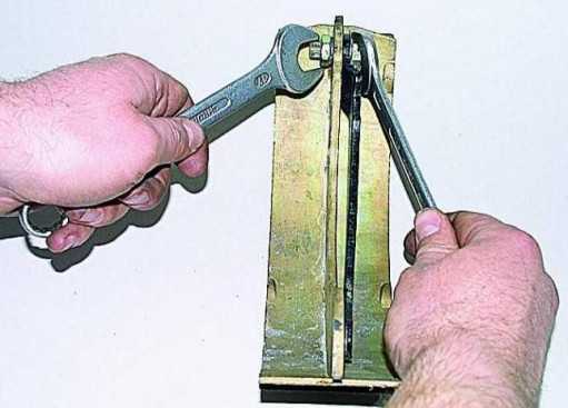 Π‘ Π²Π½ΡΡΡΠ΅Π½Π½Π΅ΠΉ ΡΡΠΎΡΠΎΠ½Ρ ΡΠΎΡΠΌΠΎΠ·Π½ΠΎΠ³ΠΎ ΡΠΈΡΠ° ΠΎΠ΄Π½ΠΎΠΉ ΡΡΠΊΠΎΠΉ Π½Π°ΠΆΠΈΠΌΠ°Π΅ΠΌ Π½Π° ΡΠ»ΡΠΏΠΊΡ ΡΡΠ΅ΡΠΆΠ½Ρ Π·Π°Π΄Π½Π΅ΠΉ ΡΠΎΡΠΌΠΎΠ·Π½ΠΎΠΉ ΠΊΠΎΠ»ΠΎΠ΄ΠΊΠΈ, Π΄ΡΡΠ³ΠΎΠΉ ΡΡΠΊΠΎΠΉ Π½Π° ΡΠ°ΡΠΊΡ, ΡΠΆΠΈΠΌΠ°Ρ ΠΏΡΡΠΆΠΈΠ½Ρ. ΠΠΎΠ²ΠΎΡΠ°ΡΠΈΠ²Π°Π΅ΠΌ ΡΠ°ΡΠΊΡ ΠΏΡΡΠΆΠΈΠ½Ρ Π½Π° 90Β°. ΠΡΠΈ ΡΡΠΎΠΌ ΠΏΡΠΎΡΠ΅Π·Ρ Π½Π° ΡΠ°ΡΠΊΠ΅ ΡΠΎΠ²ΠΌΠ΅ΡΡΠΈΡΡΡ Ρ Π½Π°ΠΊΠΎΠ½Π΅ΡΠ½ΠΈΠΊΠΎΠΌ ΠΎΡΠΈ. Π‘Π½ΠΈΠΌΠ°Π΅ΠΌ ΡΠ°ΡΠΊΠΈ Ρ ΠΏΡΡΠΆΠΈΠ½ΠΎΠΉ.