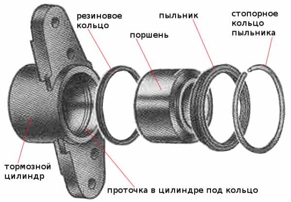 Поршень из цилиндра необходимо выдавить либо еще до его снятия (нажав на педаль тормоза), либо на уже снятом поршне подать воздух под давлением в отверстие под тормозную трубку. Перед выдавливанием снимаем с поршня стопорное кольцо и пыльник. Извлеченный поршень стараемся не поцарапать. Очищаем его от загрязнений и окислений способом описанным выше, если необходимо меняем резиновое уплотнительное кольцо, промываем и продуваем цилиндр. Перед сборкой смазываем тормозной жидкостью внутри тормозного цилиндра, сам поршень смазываем графитной смазкой. Вдавливаем его вовнутрь цилиндра (например, при помощи тисков), одеваем сверху новый пыльник и стопорное кольцо.