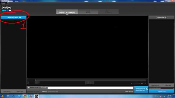 Запустите GoPro CineForm Studio и импортируйте исходные файлы с камеры с помощью кнопки IMPORT NEW FILES (Импорт новых файлов) в левом верхнем углу окна приложения.