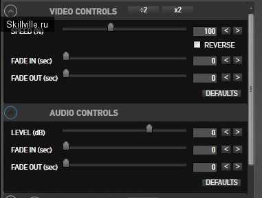 Video/Audio controls — аудио-видео настройки вашего видео. В видео можно увеличить/уменьшить скорость воспроизведения (speed) и настроить время появления (Fade in) и угасания (Fade out) видео. В настройках звука можно установить громкость звука (Level), а так же время появления (Fade in) и затухания (Fade out) аудио ряда.