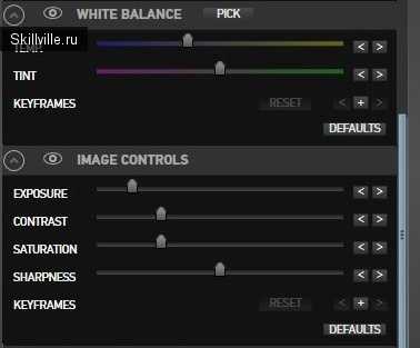 White balance — устанавливает баланс белого цвета. С помощью кнопочки «Pick» можно выбрать какой цвет считать за белый прямо на кадре. Попробуйте поиграть с параметрами Tint и Temp. Всегда можно возвратить настройки в исходную позицию, кликнув «Reset».