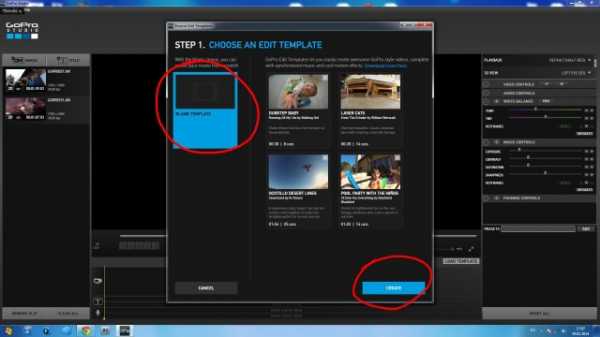 Перед нами открывается меню выбора шаблонов. Для начала рекомендую выбрать пустой шаблон (тот что справа и без картинки) и сделать видео в нем, а затем уже экспериментировать с готовыми. Жмем кнопочку «Create» справа внизу.