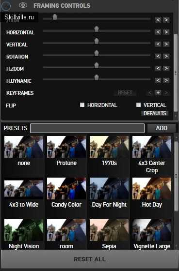 Presets — это преднастроенные светофильтры. Достаточно кликнуть на один из них и вы увидите его в действии. Внимание: если кликнуть подряд на несколько, то все наложатся сразу! Чтобы сбросить фильтры, кликните «Reset All» внизу.
