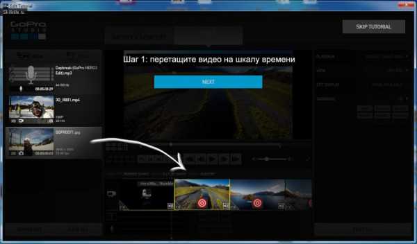 Перетаскиваем видео вниз, на шкалу времени. Т.е. на этой шкале вы можете размещать видео файлы как угодно, можете так же обрезать их, накладывать звук и эффекты. Я подробно остановлюсь именно на эффектах т.к. обрезать и склеивать видеофайлы намного удобнее в других программах, а т.к. логика работы одна и та же, то прочитав статью про монтаж видео в Premiere, вы легко его освоите и в GoPro Studio (но делать будете только в Premiere).