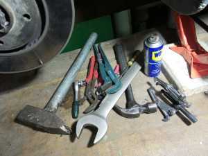 Для того чтобы произвести качественную замену в гаражных условиях, нам понадобится целый набор инструментов. Перед работой следует подготовить домкрат, отвертку, набор гаечных ключей, смазку и специальный аэрозоль WD-40 для удаления ржавчины.