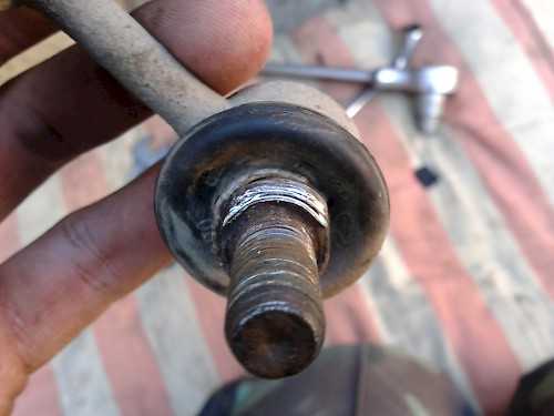 Если гайка крепления стойки стабилизатора сильно заржавела и ее не удается открутить, тогда попробуйте наоборот закрутить ее до появления витков резьбы, спрятавшихся внутри резинки. Отпилите под самую гайку верхнюю часть резьбы с помощью ножовки по металлу.